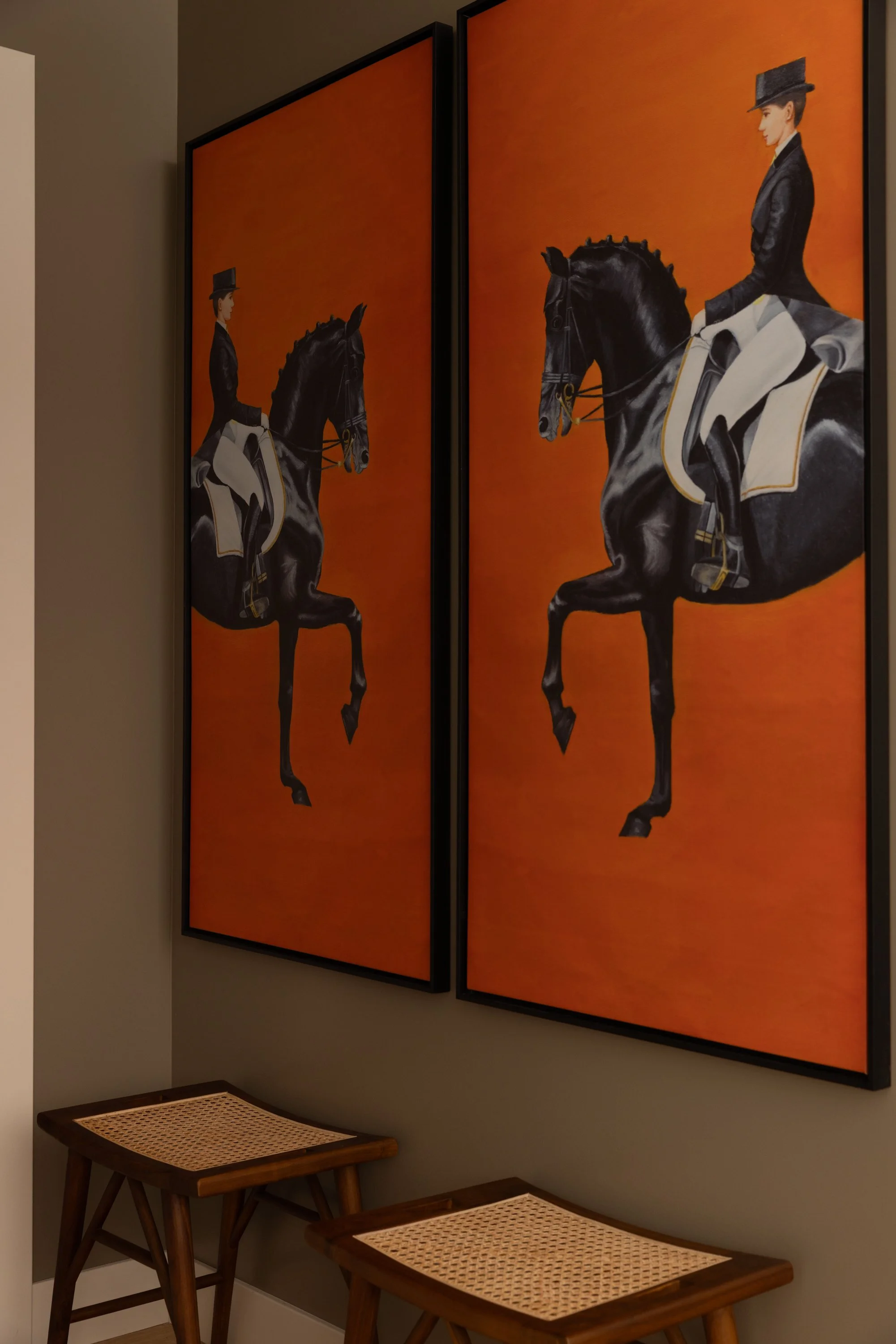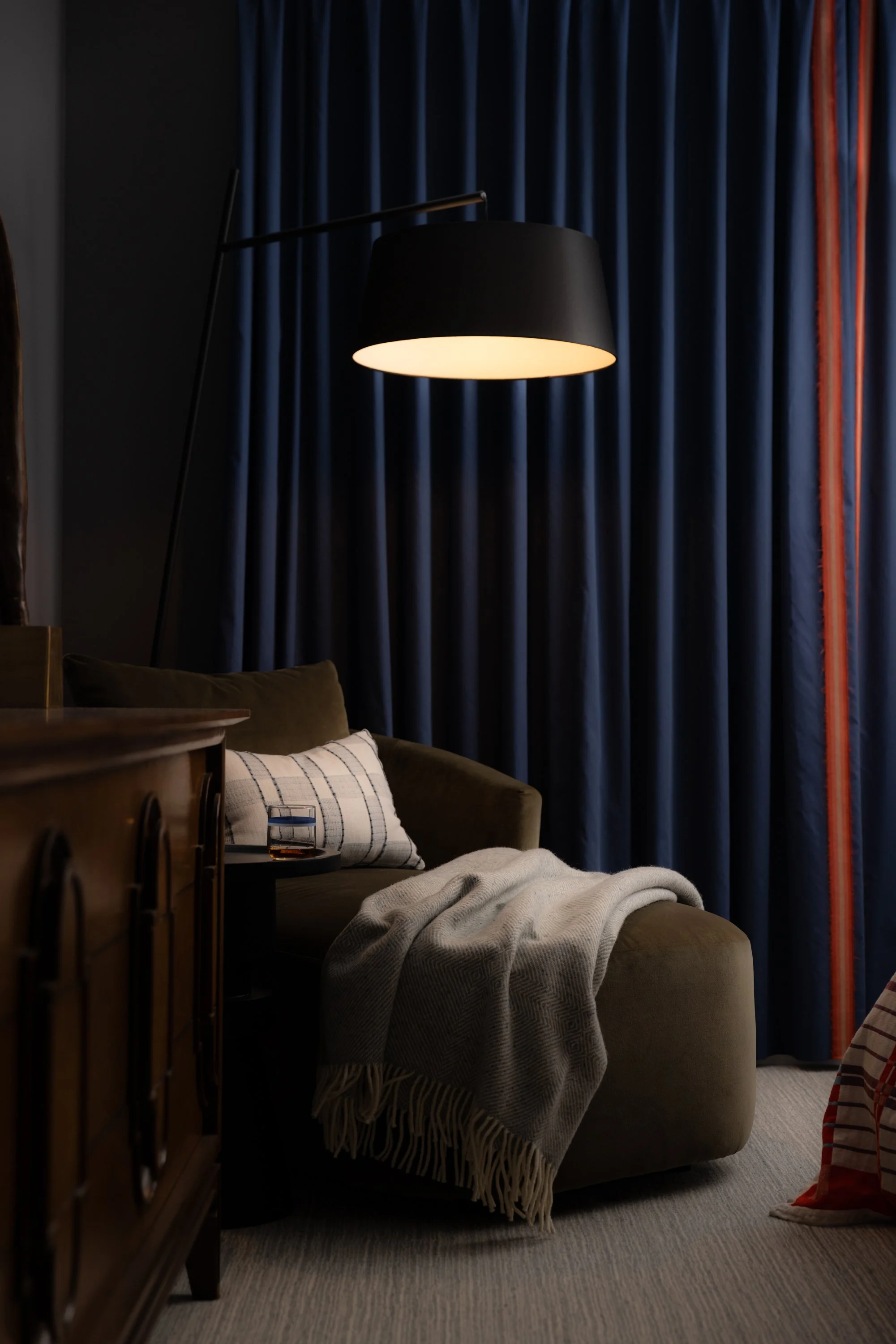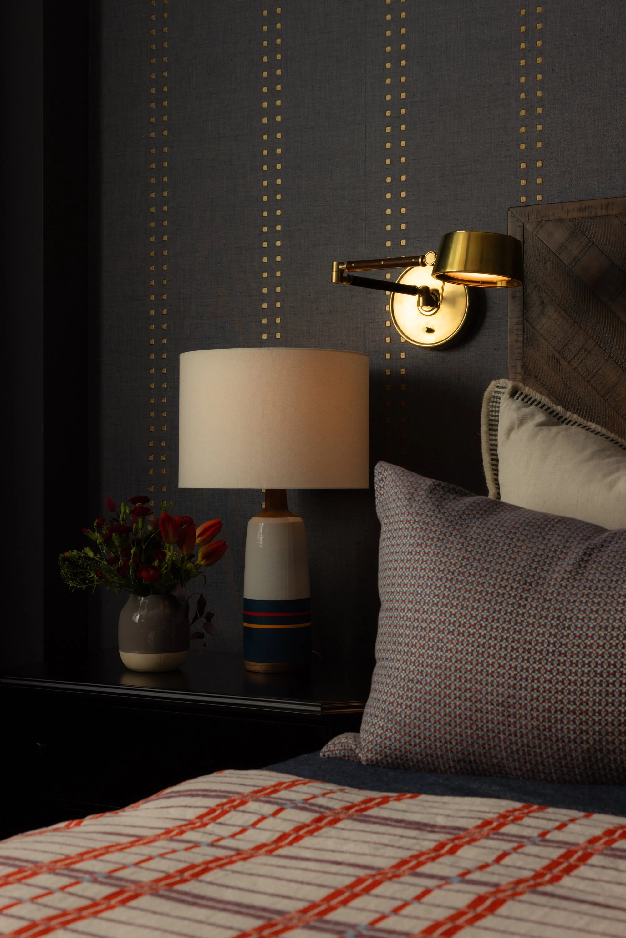 To bring in that warm, layered mountain feel, we played with a rich mix of textures: plaids, herringbone patterns, and raw, tactile materials. One standout feature? An antique American flag, framed without glass to keep the dimension and character intact.