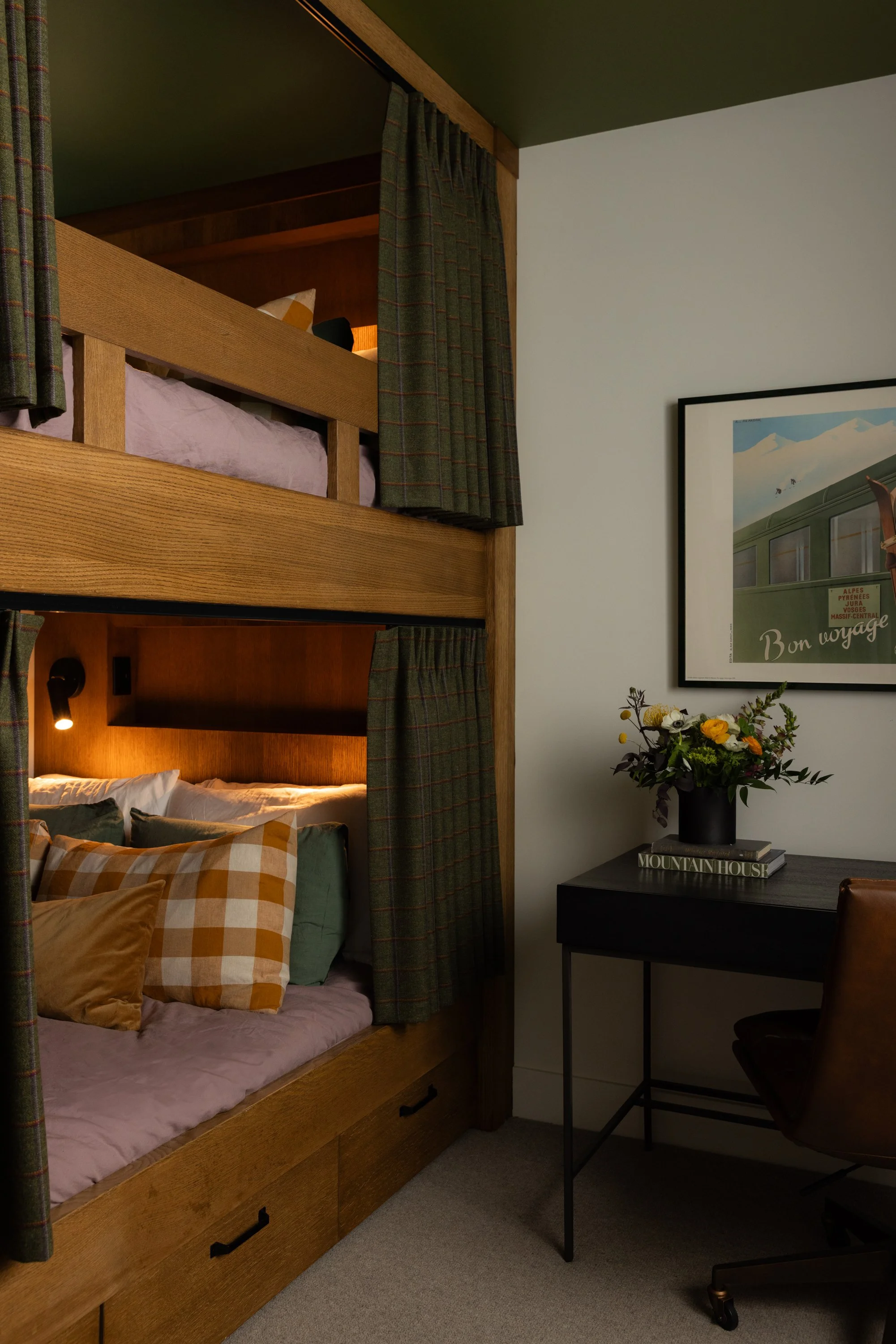 Because the home would double as both a personal getaway and a short-term rental, we prioritized comfort, durability, and maximizing sleeping space. In the secondary bedroom, we designed custom queen-over-queen bunk beds with privacy curtains—perfect for guests or a family ski trip.