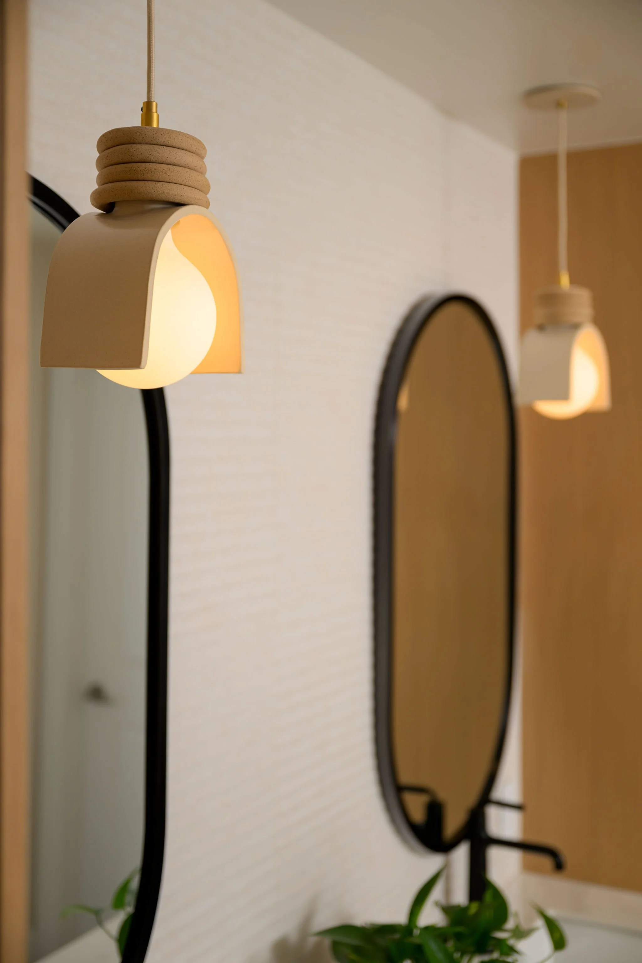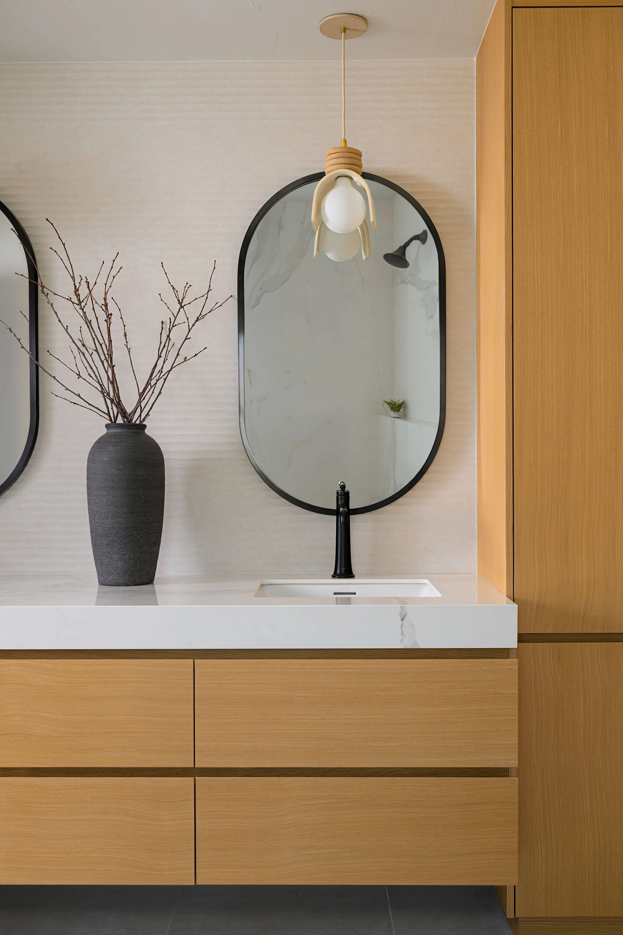 In addition to the primary bath, we also refreshed the kids' bathroom with a playful surf shack theme. A colorful ombre tile backsplash and new vanity bring the space to life, while personalized medicine cabinets with concealed electrical outlets provide storage for each daughter. The front of the medicine cabinets allow for their custom artwork, adding a unique, personal touch.