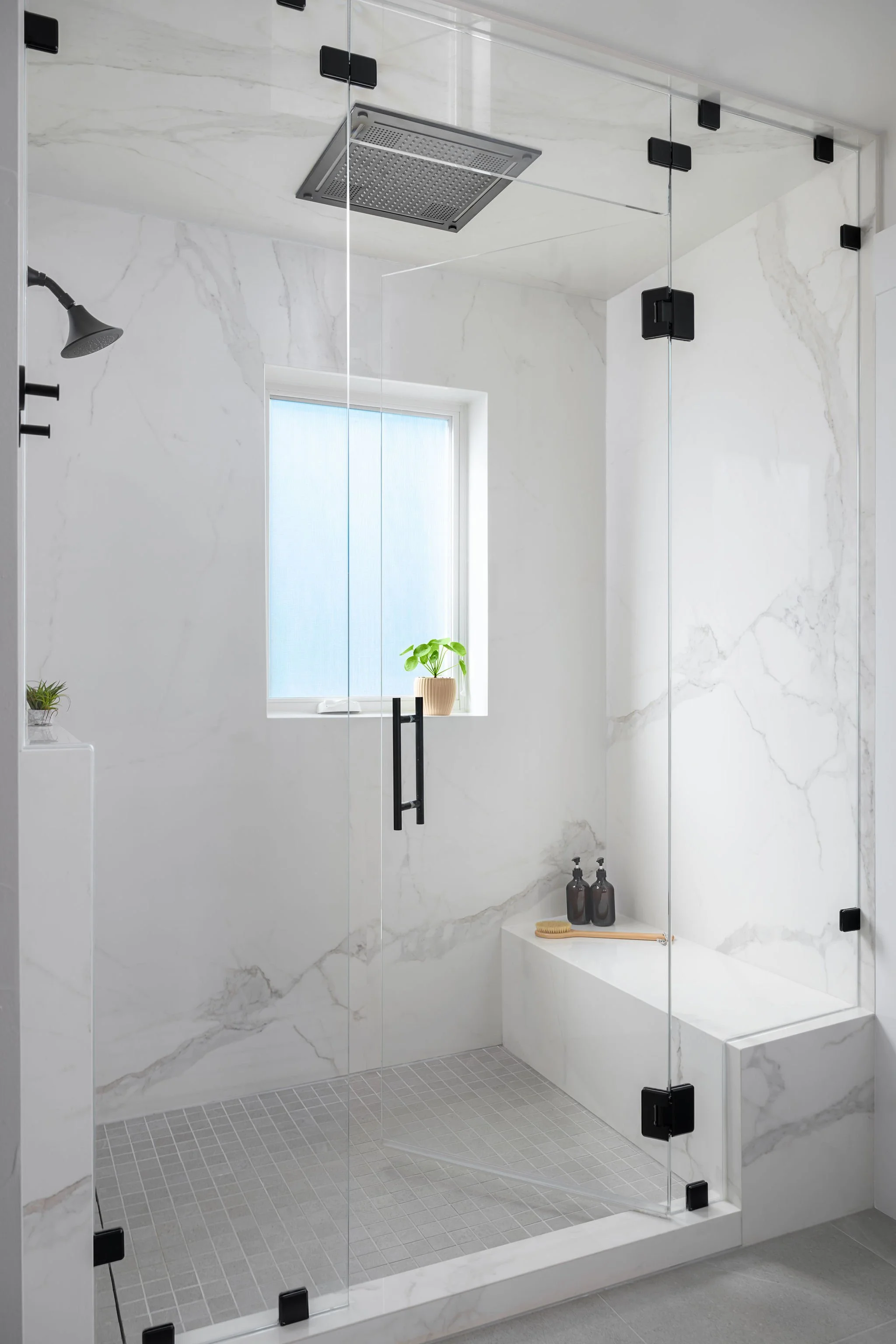 This complete primary bathroom gut renovation transformed an outdated space into a modern, spa-like retreat. We removed the old tub and relocated the previously dark shower to a brighter spot in front of the window. The new shower features a Thermasol digital system, complete with a rain showerhead, steam, and custom lighting. The minimalist design showcases neutral finishes and clean lines for a sleek, modern look. A custom wood vanity with concealed storage keeps the space clutter-free and contemporary. This renovation combines luxury upgrades with practical, everyday functionality.